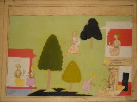 | Description / विवरण | Miniature painting depicting story of trader who is shown talking to another man at upper right part. At lower left part, he is shown taking leave above this, he is shown leaving and other man is shown sitting in his house. It is an incomplete painting. |
