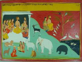 | Description / विवरण | Miniature painting based on Mahabharat - Adi parva. Kashayap sage sitting in middle. Many women and animals are also with Kashayap sage. |