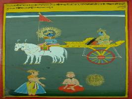 | Description / विवरण | Miniature painting based on Shri Bhagwat Gita depicting Krishna preaching Arjun that he who never think about profit through he got too much, will not regret for anything. |