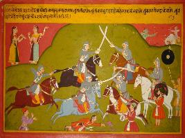 | Description / विवरण | Miniature painting based on Prithviraj Raso depicting vigorous battle between the armies of Prithviraj and Jaichand. On the top two women are talking and a man riding on elephant fighting with 2 demons. |