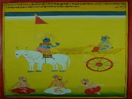 | Description / विवरण | Miniature painting based on Shri Bhagwat Gita depicting Krishna preaching Arjun that one who serve to yogis and judges his deed himself got fullness to his soul. |