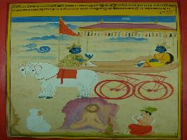 | Description / विवरण | Miniature painting based on Shri Bhagwat Gita. It depicts Krishna preaching Arjun and saying that, Sadhu whose soul is firmly dedicated to meditation, to him happiness and sorrow is equal. |