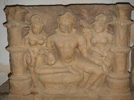 | Description / विवरण | An independent sculpture of Kubera flanked by two attendants. He is in lalitasana in a padded cushion. He is holding a fruit with his right hand and left hand is resting on his left thigh. The attendant on his right is holding the money bag and the left one is holding a garland. He is adorned with jewels like necklace, armlet etc. and a Yajnopavit and a beautiful headgear. |