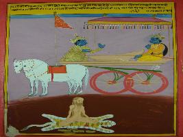 | Description / विवरण | Miniature painting based on Shri Bhagwat Gita. Krishna and Arjun where Krishna says to Arjun about knowledge some respect. |