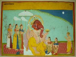 | Description / विवरण | Miniature painting based on Kadambari depicting Ganesh with Riddhi Siddhi and three female attendant standing near behind him. |