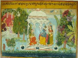 | Description / विवरण | Miniature painting based on Geet Govind. Krishna is depicted talking to messenger of Radha. It is a scene on bank of Yamuna and Vrindavan is depicted. Two females depicted on one corner and Kamdev depicted on tree looking to them. |