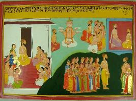 | Description / विवरण | Miniature painting based on Mahabharat - Adi parva depicting Brahma having seven sons, one of them is Kashayap who gets married to thirteen daughters of Daksh and they give birth to twelve sons. |