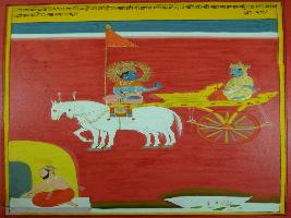 | Description / विवरण | Miniature painting based on Shri Bhagwat Gita. It depicts Krishna preaching Arjun that in the holy place everybody make Dhyana for Krishna. |