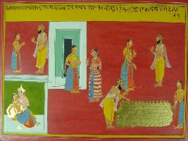 | Description / विवरण | Miniature painting based on Mahabharat - Adi parva depicting Vedvyas is coming to meet Gandhari and he fulfilled 100 pitcher from which Kauravas born. At the lower right have is making of Gandhari and Dhritrashtra is seen. |
