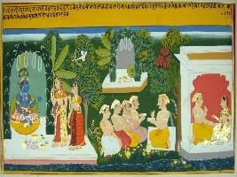 | Description / विवरण | Miniature painting based on Geet Govind. On one part Krishna is depicted seated and two gopis are standing in front. On the middle part a man is depicted talking to four men and on the one end a couple is depicted talking. Kamdev is depicted on tree making aim on Krishna. |
