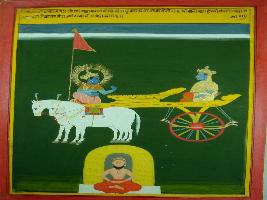 | Description / विवरण | Miniature painting based on Shri Bhagwat Gita. It depicts Krishna preaching Arjun that by sitting in a one position if anybody began to worship him than he will be there. On the painting a sage also depicted in the lower part of the painting. |