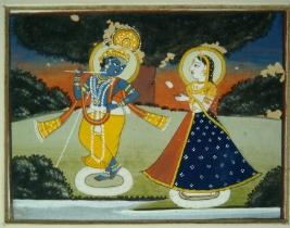 | Description / विवरण | Miniature painting depicting Maha rasa Lila scene. It depicts Krishna playing flute in right hand and his left hand is on his waist. Radha is standing besides him. |