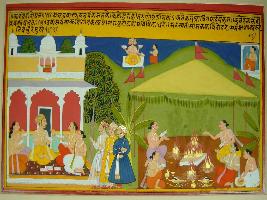 | Description / विवरण | Miniature painting based on Kadambari depicting a king seated with few sages and three men standing near them, on left of it a scene of sacrifice Yagna is depicted. On the top centre part Lord Brahma has been seen with a devpurush. |