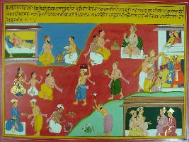 | Description / विवरण | Miniature painting based on Mahabharat - Adi parva. It depicts that Vashishth s grandson is Parasurama. He is talking with mother and father. A Brahman is demanding property from a king, the king is donating the property. |