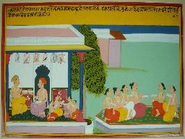 | Description / विवरण | Miniature painting based on Kadambari depicting parrots in cages on the right hand side and below it two men seated together with four children, On its left few Brahmans are seen being seated together. |