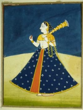 | Description / विवरण | Miniature painting based on Maha rasa Lila depicting gopi standing with chauri in her left hand. |
