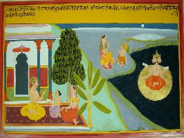 | Description / विवरण | Miniature painting based on Kadambari depicting at the right side a noble man sitting with his son and wife outside the house. At the upper centre, Garuda is depicted with folded hands in front of a lady. At the left side Brahma is depicted in a sea holding manuscripts in his two hands. |