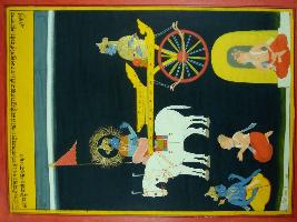 | Description / विवरण | Miniature painting based on Shri Bhagwat Gita. It depicts Krishna preaching Arjun that he who perform yoga for his own soul will get Paramgati and attain Krishna. |