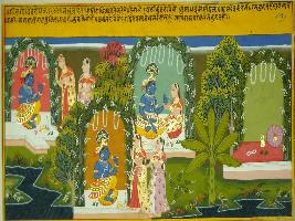 | Description / विवरण | Miniature painting based on Geet Govind depicting of holy union of Krishna and Radha, in Vrindavan on river bank. |