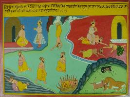 | Description / विवरण | Miniature painting based on Mahabharat - Adi parva. King Kalmaspad had killed the son of rishi Vashishth. It started burning his body by rishi Vashishth. He then jumped in the sea to cool himself. |