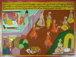 | Description / विवरण | Miniature painting based on Mahabharat - Adi parva depicting Kalmakh going towards forest and meeting a sage. The sage told him he is very hungry and king offered him flesh to eat, sage cursed the king seeing the food that he will have human flesh one day. |