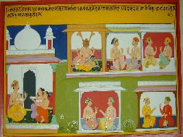 | Description / विवरण | Miniature painting based on Kadambari depicting a Brahman telling stories to his disciples. In lower left, two men are shown talking in two different level. In upper level, two men are shown talking. In the middle upper part, Narasimha is shown killing Hiranyakashyap. |