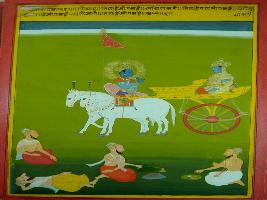 | Description / विवरण | Miniature painting based on Shri Bhagwat Gita. It depicts Krishna preaching Arjun that the one who eats a lot doesn t get Jog and in similar may one who sleeps a lot doesn t get Jog . |