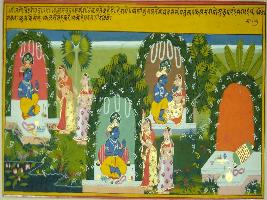 | Description / विवरण | Miniature painting based on Geet Govind depicting a holy union of Krishna and Radha. Some gopis also is depicted. |