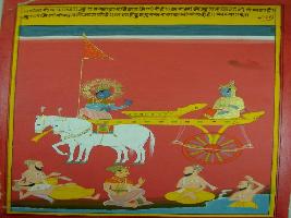 | Description / विवरण | Miniature painting based on Shri Bhagwat Gita. It depicts Krishna preaching Arjun about Karma and causes of sorrow and peace of human kind. |