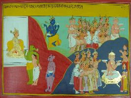 | Description / विवरण | Miniature painting based on Mahabharat - Adi parva depicting all gods going to Brahma and after that along Brahma they all going to Vishnu. |