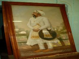 | Description / विवरण | Full length, portrait of Rao Maldevji, standing facing right in easy pose, with hands folded, and wearing a turban with a jewelled sarpech, pearl necklaces with pendants and white royal costume. Hilt of a dagger is visible at the waistband and a shield is also hanging from it. |