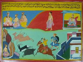 | Description / विवरण | Miniature painting based on Mahabharat - Adi parva depicting Vishwamitra leaving his crown and coming to forest. On the way king Kalmakh was hunting the boar. When Sagatri sage is coming to this side a woman blocked his way. |