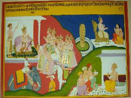 | Description / विवरण | Miniature painting based on Kadambari depicting a man telling the story to other men at lower left part. At the upper right two messenger is shown, coming to court of king, then shown sitting in front of king. At the upper left, king is shown talking to two Kumars. |