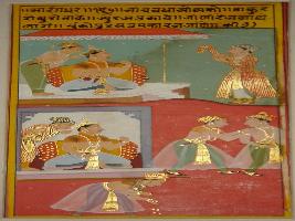 | Description / विवरण | Miniature painting based on Sarangadhar. On the upper part a king is depicted sitting on throne with two men nearby. In the central part one king is depicted with three men, one man is depicted throwing coins. |
