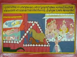 | Description / विवरण | Miniature painting based on Mahabharat depicting depicting Dhritrashtra and other Kauravas. A messanger came and informed them Krishna is coming than Dhritrashtra replied let him come with honour. On the other side Shri Krishna is seen. |
