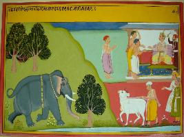 | Description / विवरण | Miniature painting based on Kadambari depicting elephant roaming in forest at the right part. At the lower left, a man is taking away a cow. At the upper left, king is giving alms to the Brahmans. |