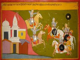 | Description / विवरण | Miniature painting based on Prithviraj Raso depicting Prithviraj telling his Samants that if they wish he can even go in front of a lion. |
