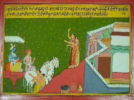| Description / विवरण | Miniature painting based on Mahabharat depicting that Krishna is going to Hastinapur where Brahma also honoured him. The weather of Hastinapur is not good as mentioned in the painting. |