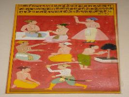 | Description / विवरण | Miniature painting based on Sarangadhar. On the upper part a man is depicted sitting and two men in front of him- one sitting and one standing. In the middle part three people are depicted- two talking and one pouring water to a tree, and in the lower part a man holding sword is depicted running towards a seated man. |