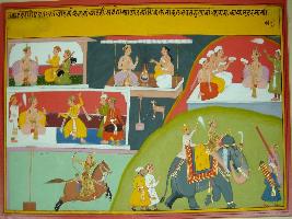 | Description / विवरण | Miniature painting based on Kadambari depicting a king and it also depicts that how the art of music, dancing and archery is developed under his patronage. In the lower left corner the king is seen that travelling on an elephant. |