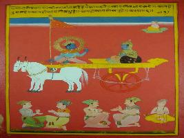 | Description / विवरण | Miniature painting based on Shri Bhagwat Gita. It depicts Krishna telling, Arjun that a man is responsible for his moksha, he himself is his friend and he himself in his enemy. |