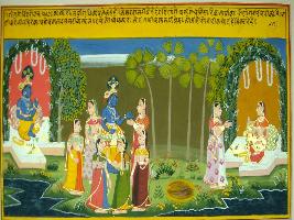 | Description / विवरण | Miniature painting based on Geet Govind depicting a Scene in which a friend with Gopis in the middle while at the right side Krishna seated. |