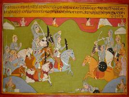 | Description / विवरण | Miniature painting based on Prithviraj Raso depicting a battle that took place in between Panga king and Prithviraj Chauhan s army. It also depict Shiv, Indra and some other Devtas on top of the painting. |