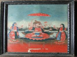 | Description / विवरण | It is a painting of Ganesha. He is shown in padamasana. He is sitting upon lotus. Two female attendant are shown on either sides holding white lotus. A golden crown is shown on head of Ganesha holding his attributes in his four arms. |