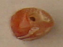 | Description / विवरण | Small bead of chalcedony, with a hole. Designs with white on the circular body. |