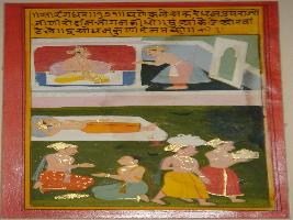| Description / विवरण | Miniature painting based on Sarangadhar. On the upper part a king is depicted talking to his servant in a palace, in the centre, a man is sleeping, in the lower part four people are depicted two in standing and two in sitting postures. |