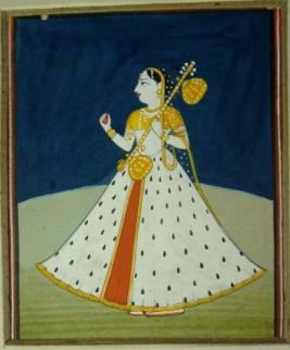 | Description / विवरण | Miniature painting depicting Maha Rasa Lila scene. It depicts a gopi in standing pose. She is facing right and holding a sitar in her left hand. |