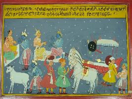 | Description / विवरण | Miniature painting depicting Arjuna telling Sri Krishna to try to do good for both side while he going as a messanger Ratha is ready for Sri Krishna in the morning and he is ready after having bath. |