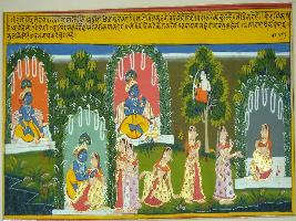 | Description / विवरण | Miniature painting based on Geet Govind depicting Radha and her Sakhi and she says to Radha that Krishna sits on throne and thinks about you and you are seen seated and Gopis are watching them. Kamdev is seen seated on a tree. |