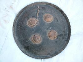 | Description / विवरण | This is a small leather shield which is concave from outer side and concave from inner side. Outer side is having designed dome shaped four knobs. Inner side is having two leather belt and four iron made rings. It is having upwards raised edge. |